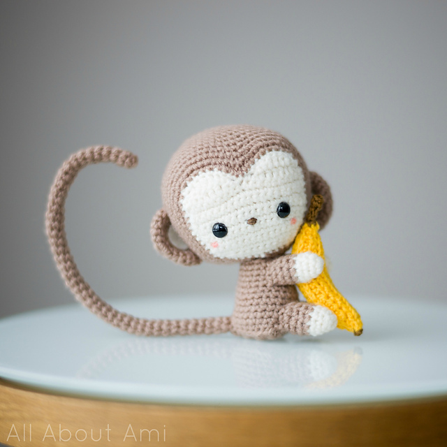 Crochet your own adorable monkey with a poseable tail and arms! His sweet little face will melt your heart, and he is holding his favourite food: a banana!
