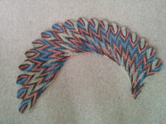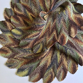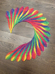This shawl uses only one skein of any sock yarn of your choice but it looks best when the color is variegated. Choose bright jewel tones for a tropical bird of paradise look or a more subdued colorway for a dreamy soft look that just hints at the shape of feathers.