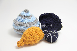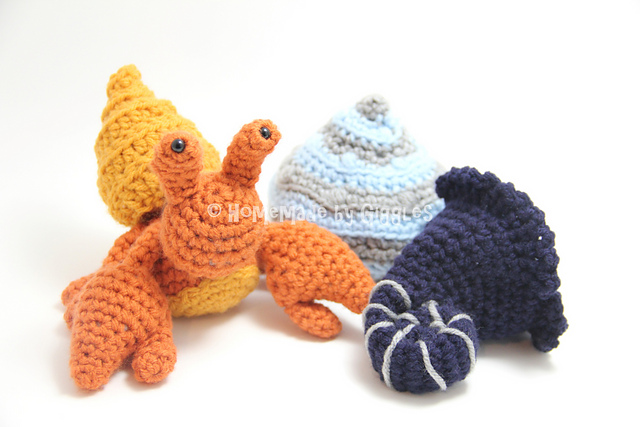 Stuffed Hermit Crab amigurumi pattern with a few removable shell options to make it fun to play with! Pattern includes full crab instructions and assembly, as well as 3 different shell patterns shown in the pictures.