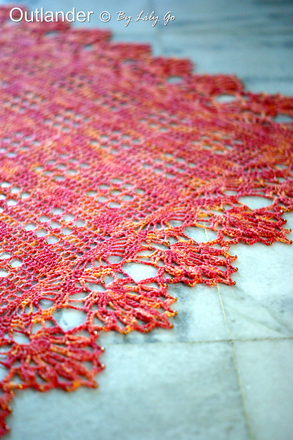 **Outlander** is a beautiful triangle shape shawl that both enjoyable to make and easy to wear. This shawl can be made both in lace or fingering weight yarn. As with all my other patterns, this pattern comes with row-by-row written direction in US crochet term and charts.