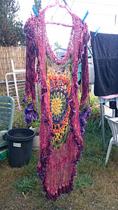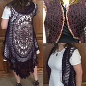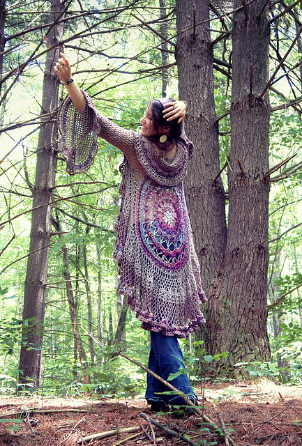 A stunning circular jacket sure to get attention with a central mandala design and tons of floaty ruffles, alluring mesh stitching, and mega dramatic pointed bell sleeves! Now available in both Small and Large :)