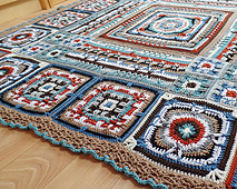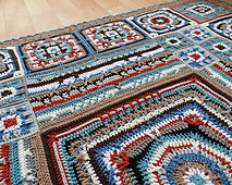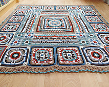Gauge is not essential for this project. As a guide, the big central square turned out roughly 16 inches for me, worked in DK with a 4.5mm hook. The smallest squares were 4 inches, the medium squares 8 inches. If your central square is smaller, your blanket will be correspondingly smaller. If your square is bigger, your blanket will be bigger. Use what feels comfortable to you with the yarn you choose. I tend to have a tight gauge; use your own judgement as to whether you want to go up or down a hook size, or even two!
