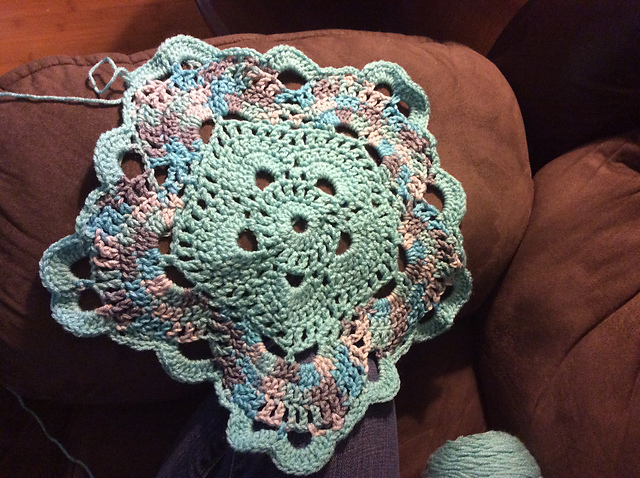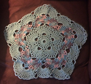 I created this 5 sided design myself. No pattern guidance other than the traditional 4 sided as noted previously. I am using 2 skeins of red heart yarn, one solid and one variegated and my favorite 5mm H8 crochet hook. This pattern can work up to whatever size you choose. Please enjoy and if I have an error in my instructions let me know. Thanks!