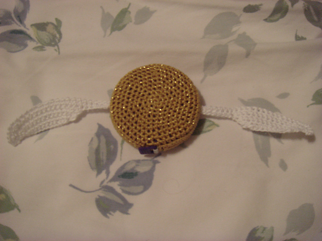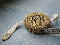 Tape measure cover crocheted in 3 pieces - a solid piece to encase the tape measure and two wings that are sewn on.