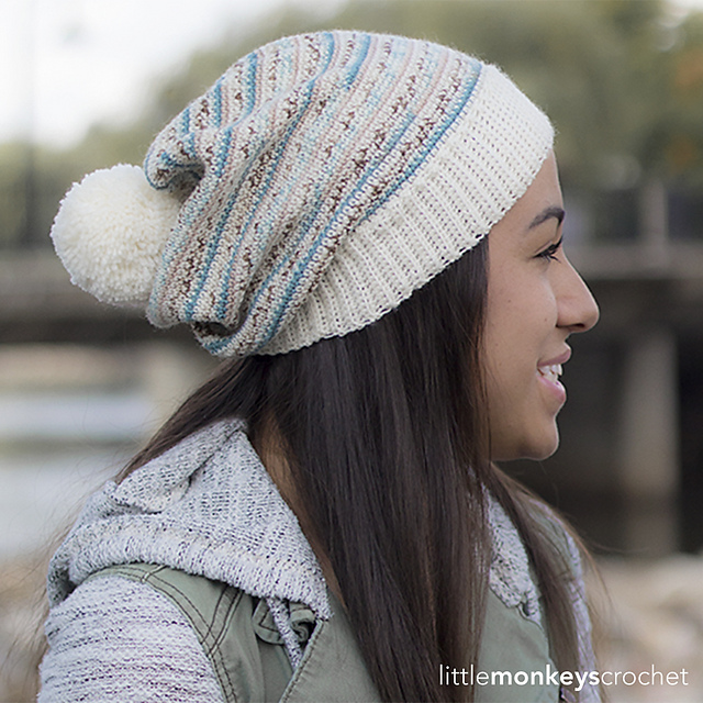 My other philosophy of using busy yarn is that it helps to balance it out with a not-so-busy yarn, so I did the ribbing in Heritage Solids in the color Snow, and I also made a pom pom with my Clover Pom Pom Maker using the same yarn. The resulting hat has such a nice feel and drape. Like wearing a cozy sock on your head! :)