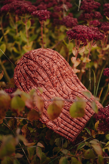 1 skein of Cecily Grove Yarns Luxe DK: 75% merino, 25% silk. 225 m/246 yards per 100 grams. Show in colorway Rust.