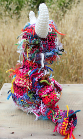 The knots and loose ends from the Crazy Yarn will fall to the back of your work. The sample shown has the reverse side of the stitches facing the outside of the toy, for added interest.