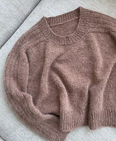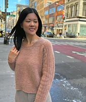 The Skyline Pullover is a top-down saddle shoulder construction with ribbing detail that starts at the neckline and flows seamlessly down the sleeves to the cuffs. Fingering and lace weight yarns are held together to create a fluffy and dreamy fabric. Alternatively, a DK weight yarn is a suitable substitute for this pattern. Short rows are worked on the back and sleeves (at the upper arm) to form a comfortable fit for this classic piece.