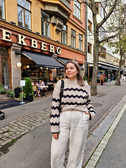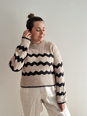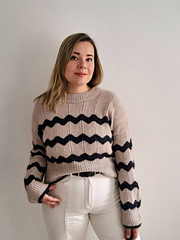 The Lykke pullover has a boxy fit and dropped shoulders. The chevron stitch pattern is knitted by increasing and decreasing stitches. Despite the zigzag pattern, there is no stranded colorwork in the pattern. Instead, the colors are knitted in stripes and the chevron stitch pattern creates the zigzag effect. The increases over the chevron pattern on the back and front neck are fully charted.