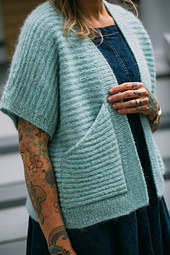 This cardigan is worked from the bottom up, seamlessly, except for the underarms. The shoulders are finished with an exposed seam using the 3 needle bind off. The collar & cuffs are picked up and knitted out from the body. The pockets are knit separately and sewn on once the cardigan is finished.