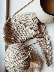 The Nova Scarf is worked flat in garter stitch with an I-cord edge on one side of the scarf and a lace edge on the other side. It is knitted in three sections: a section with increases, a middle section and a section with decreases.