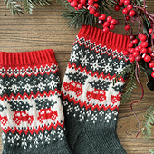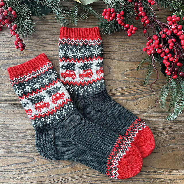 These socks are knit from the cuff down. It begins with a tubular cast on and a ribbed cuff. The leg and a part of the foot are knitted with a colorwork pattern. Then the heel flap and the gusset are knitted back and forth. Finally, the toe is worked in the round and finished with Kitchener stitch.