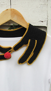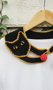Collar is crocheted bottom-up with an applique added after the “body” part is finished. The ball/button is crocheted and stuffed with yarn/fabric/etc. Whole pattern is mostly single crochet stitches.