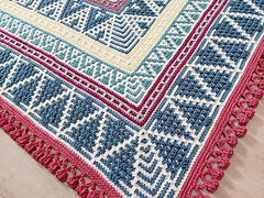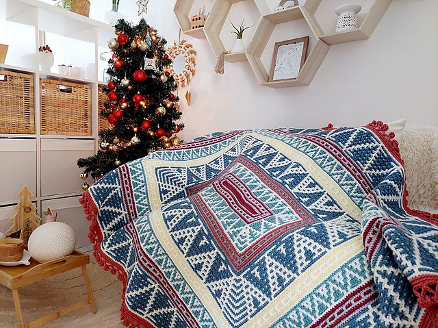 The COZY MOSAIC CHRISTMAS pattern is worked from the center out and creates a rectangular shape blanket. The length of the rectangle is easily adjustable by changing the length of the starting chain. The pattern includes more detailed info about this step. You can use this pattern to create a poncho as well. The pattern requires at least two highly contrasting colors.