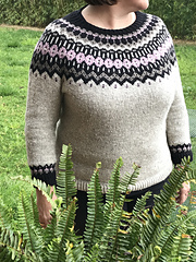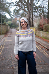 Fitu is a yoke sweater with stranded colourwork and it’s knitted from the top down. It has 9 women sizes and 8 men sizes. The yoke is very easy – no more than two colours per round and it’s possible to knit it without needing to catch any floats. This sweater is knitted in the round without any seams. After knitting the yoke the sleeve stitches are put on hold while you finish the body and then recovered to knit them from the underarm to the cuff.
