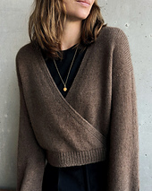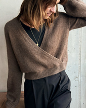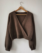 Der Pullover wird nahtlos von oben nach unten gestrickt. Zunächst wird die hintere Halsausschnitt-Blende gestrickt, aus der dann Maschen für das Rückenteil aufgefasst werden. Nachdem das Rückenteil mit Hilfe von Zunahmen geformt ist, werden linkes und rechtes Vorderteil direkt an das Rückenteil gestrickt. Für den Rumpf werden Rücken- und Vorderteile miteinander verbunden und es wird weiterhin in Reihen gestrickt. Ist die entsprechende Länge erreicht, werden linkes und rechtes Vorderteil miteinander verbunden, so dass die Wickel-Optik entsteht. Die Jacke schließt mit einem Rippenbündchen ab. Für die Ärmel werden Maschen aus den Seitenrändern der Vorderteile und des Rückenteils aufgefasst und glatt rechts in Runden gestrickt, abschließend wird ein Rippenbündchen gearbeitet.