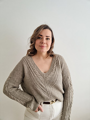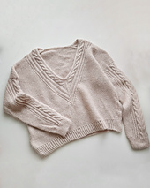 The beautiful cable pattern is worked on along the sides of the v-neck as well as on the sleeves. The cable pattern is very beginner friendly.