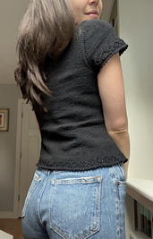 A romantic, feminine blouse that skims your curves. It’s knitted seamlessly from the top-down, with short-row shoulder shaping as well as waist and hip shaping along vertical darts on the front and back. The pattern includes suggestions on where and how to customize the fit for your specific measurements. The cap sleeves are shaped with German short rows, and a lace hem and crocheted picot border finish off all edges.