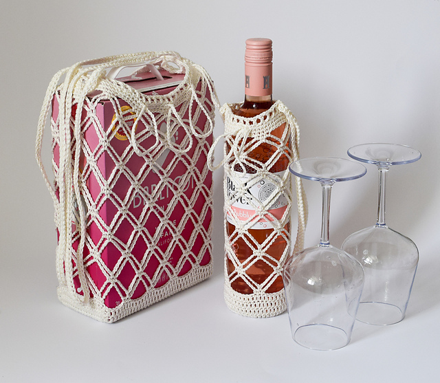 This is the perfect crocheted housewarming gift or a gift for the 21 year old. Carry your wine safely in this wine caddy that also fits two-four wineglasses. Perfect for the amazing summer evening picnics or block parties.
