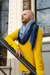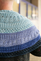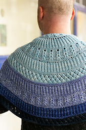 *Select four shades of DK weight yarn to knit this ornate assemblage of brioche and dip stitches. The shawl begins at the top center with an I-cord Tab Cast on, followed by a textured droplet stitch. Single color brioche ribbing occurs between the various dip stitch sections with garter ridges framing each texture. Use a gradient or fade of colors from light to dark and enjoy the beautiful stitch details throughout this semi-circular shawl.*