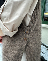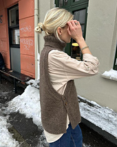 The Lulu Slipover – Chunky Edition is worked from the top down. The slipover has a deep armhole and is closed with two buttons along both sides. First, the back is worked and then the front. Ribbing edges are worked along the armholes, and along the sides, which form slits towards the hem, double knitted edges are worked. Two buttonholes are worked along the front part of these double knitted edges. At the end, a ribbing edge is worked along the neck opening.
