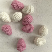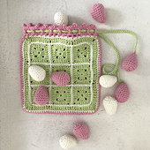 The playing eggs are crocheted as amigurumi in continuous rounds. The tote is a construction of granny squares.
