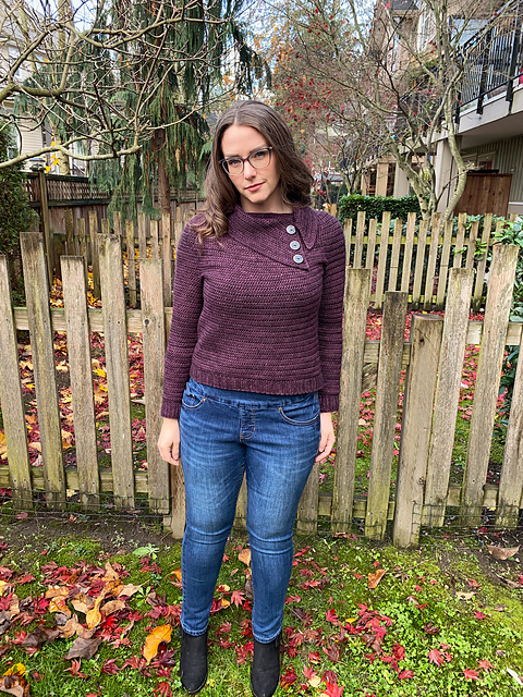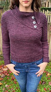 Spruce up the cool-weather section of your wardrobe with the Into the Archives Sweater! The details don’t stop with this one, including an adorable split cowl neckline, button accents, and stunning ribbing on the hem and cuffs. It is a versatile garment that can easily be dressed up for the office or a date night, or worn more casually with a cozy-but-cute errands outfit. This is an easy difficulty level pattern, designed for the adventurous beginner crocheter, and is a top-down, circle yoke garment. The Into the Archives Sweater is designed with 1-4” of positive ease at the bust for a moderate, comfortable fit.