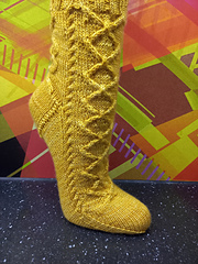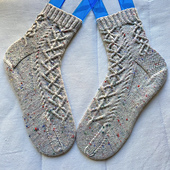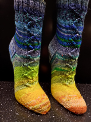 In the Twilight is worked cuff down with columns of shadow cables. The front/instep cable placement differs between Sock A and Sock B.