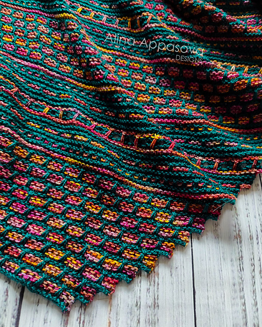 **Dutch Tulips** is a delightful little shawl, that combines all my favorite stitches and techniques: mindless garter stitch, engaging mosaic knitting, and delicate eyelets. Repeats are short and easy to memorize. Only one color at a time. No purling. I promise you'll enjoy knitting it!