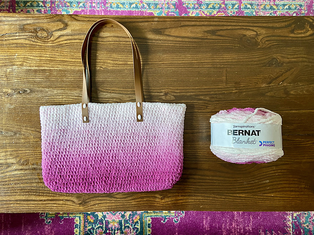 An easy tote designed to use one cake of Yarnspirations Bernat Blanket Perfect Phasing super bulky chenille yarn. Here's the tutorial video on YouTube: https://youtu.be/ZNkF76V555o
