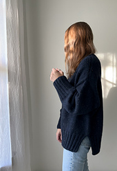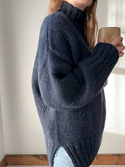 The Constellation Sweater is worked from the top down. The shoulders are shaped for a comfortable oversized fit while also adding a structural element to the sweater. The sweater begins with a ribbed collar and is finished with a split hem. The construction hugs the shoulders, creating a feminine silhouette.