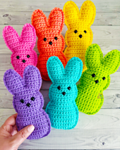 Our finished Mini Easter Marshmallow Bunny project is 7" x 3.5" using the recommended hook size. You are welcome to go up or down a hook size to create a different dimension. You can even hold two pieces of yarn together with a larger hook to create a giant cuddler. The sky is the limit!