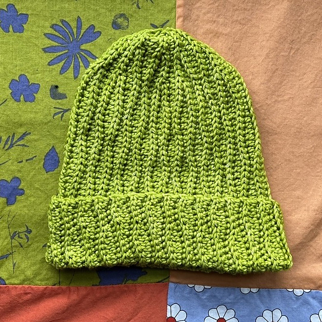 * Tight crocheters may want to size up to a 5.5 mm hook. Row gauge is more important than stitch gauge for this pattern. Pick a yarn and hook combo that gives you the row gauge, and adjust the stitch counts so that the hat remains a length of 11.5”-12”. If you make it longer than that, you’ll probably need a second skein.