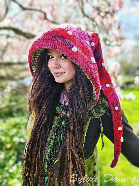 La capuche champignon et sa capeline de mousse sont crochetées d'un seul morceau. En revanche les points blancs sont cousus sur la capuche.