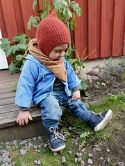 **Knopp pixie** is a soft little bonnet for the little ones. Knopp is knitted flat from side to side, beginning at the forehead and grafted together at the back of the head. An attached i-cord shapes the nape of the pixie hat and forms the ties. Knopp is knitted in a combination of broken rib stitch and garter stitch, making it stretchy in all directions, fitting little growing buds perfectly.