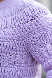 35 (39, 42, 47, 50) (55, 58, 63, 66)″ / 89 (99, 107, 119, 127) (140, 147, 160, 168)cm finished chest circumference. Measurements taken after blocking.