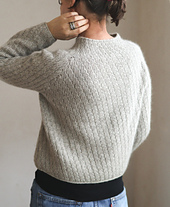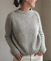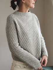 The ARMOR sweater is worked seamlessly from the top down. Start working the collar in the collar stitch pattern and then increase for the armor stitch pattern. Then the yoke is worked with raglan increases to sleeve separation. The sleeve stitches are then placed on hold, underarm sts are cast on, and you continue to work the body in armor stitch to the bottom. After the body is completed, the sleeve sts are picked up again to work the sleeves top down in armor stitch in the round to the end.