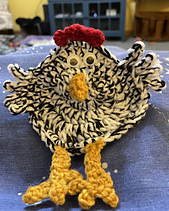 It is perfect for using leftover wool. You only need a few meters. The chicken can also be transformed into a colorful bird of paradise if you use all sorts of small leftover wool.