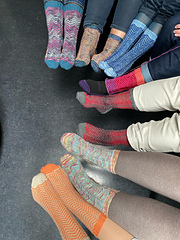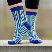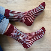 The socks are worked cuff-down with a standard flap and gusset heel. The chevron pattern is worked in 2-row stripes, and borrows from the shadow knitting technique to create the illusion of vertical stripes.