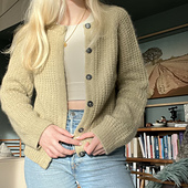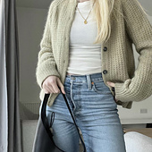 The Fennel Seed Jacket is a relaxed-fit raglan cardigan featuring a simple broken rib texture and neat double knitted details. It is knitted from the top down, with the body being knitted flat and the sleeves later being added in the round. Stitches are picked up for the double knitted button band, and finally a double knitted collar is knitted.