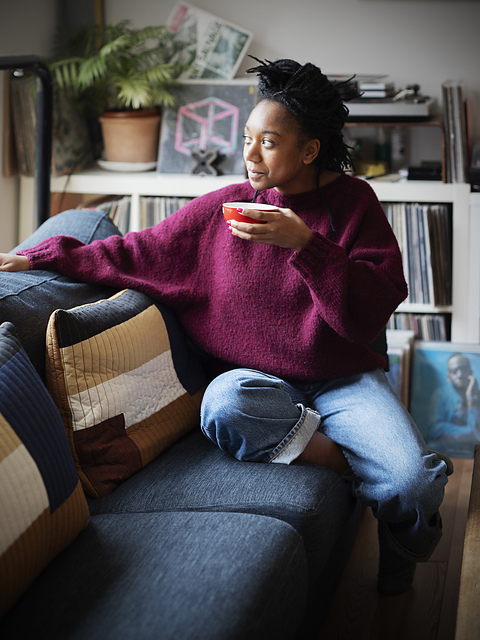 Janni is knitted from the top down, seamlessly. The neckline is shaped with short rows and the shoulders and upper body are worked together using increases (no stitches to pick up along the shoulder band). After the deep armholes, sleeve stitches are put on hold to be knitted later in the round. The lower body part has a few side decreases for a well-balanced fit, but you can omit them if you prefer. To add structure and durability to the garment the collar stitches are picked up at the end and knitted in the round. The ribbing ends with a simple rolled edge.