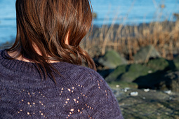The Salty Air Sweater is knit seamlessly from the top down. The neckline is cast on and short rows are worked to raise the back of the neck for a comfortable fit. The lace yoke is knit, raglan increase rounds are worked, then the body and sleeves are separated and worked from the top down. The sleeves can be knit with or without shaping. The collar stitches are picked up and knit for either a folded or a flat collar.