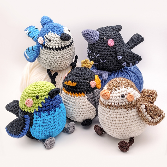 *This pattern contains five patterns to create a fun bird (or rather birb) gang whose members are Groovy (the Groove-billed Ani), Pengu (the King Penguin), Jale (the Blue Jay), Tanpa (the Paradise Tanager) & Buntie (the Snow Bunting).*