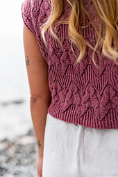 The tee is worked from the top down with Half Twisted Rib on the shoulders and neckline shaping. The upper body is worked flat to desired armhole depth, then front and back are joined to work the lower body in the round. The lace pattern flows from and towards Half Twisted Rib for the hem. Stitches are picked up around the armhole to work a small Half Twisted Rib edging, and around the neckline to bind-off immediately and create a neat line.