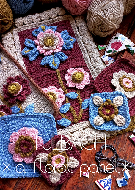 * We will create 4 beautifully textured floral panels, plus smaller squares that can be used to join our decorative Panels or border the completed Throw.