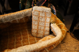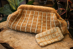El Clutch McDuff es un bolso de lana afieltrada que se teje de la base hacia arriba en circular. Se remata con ayuda de un ganchillo para hacer las líneas verticales del patrón.