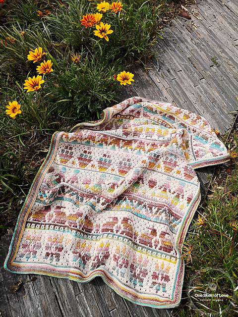 The blanket is divided into 6 parts. The first 5 parts will create the blanket body. The last part will be dedicated to the border. There are 11 different patterns distributed in the first 5 parts of the blanket. You can play with the patterns or repeats to create a bigger or smaller blankie or to create other house decor itens. You can also add patterns from my Hello Spring design as they use the same stitches repeat.
