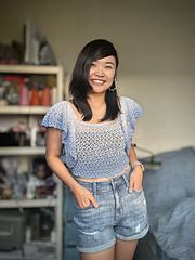 This design was created as a celebration of my 10+ years of working in my company, hence the name, Deka. This pattern is made-to-measure, which means you make the top following your own measurements and preference; trying the WIP on as you go is highly recommended. It’s worked from top to bottom: the front panel is made first, then the body is worked continuously in turned rounds, followed by the straps and the sleeves. This is a two-row repeat pattern, made with HDC rows. A negative ease is recommended for this top, but you can adjust according to your preference. There are three options for this pattern: the Crop Top, the Babydoll Top, and the Dress.