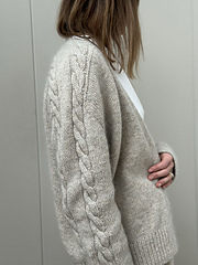 The cardigan is knitted top down in one piece and is sewing-free. Begin by casting on stitches at the centre of the back, then knit back and forth in a wide rib pattern and with cables – first over the left and then over the right shoulder. Pick up stitches along the front edges of the shoulders and the back. Then, continue knitting back and forth in the wide rib pattern with cables, while simultaneously knitting increases for the sleeves and neck and later for the arm holes.