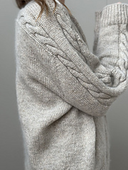 The work is then divided, and the body and sleeves are knitted individually. The body is knitted back and forth and concluded with a ribbing and tubular bind off. The sleeves are knitted in the round with cables and concluded with ribbing and tubular bind off.